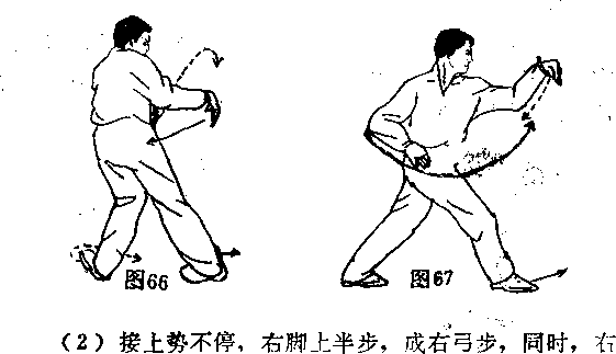臂折回由右向前滚肘,左勾手变侧掌,,贴于右前臂内侧,目 视右肘前(如图68)。 1