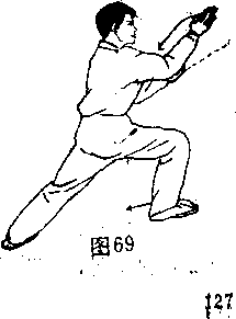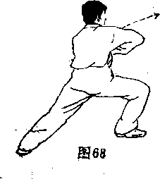 接上势不停,两脚原地不动,同时,右手以肘为 轴,从左臂下向前外,翻掌砍出。力达掌外缘,掌心向左, 左掌托于右肘下,目视右手(如图69)。
