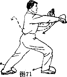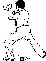 (4)接上势,身体 心后移至左脚,右脚回收成右虚 步,右脚掌踏实,同时,左镖手向前镖出。右侧掌收回腹 部,目视左手(如图70)。