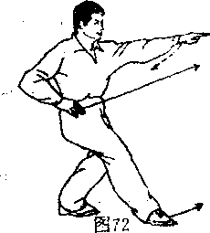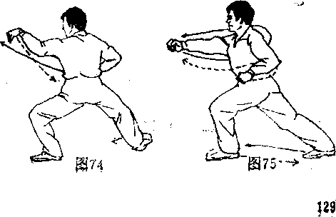 (4 )接上势',右腿向后蹬直,上体左转50°成左弓 步,同时,右掌变立拳,从腰间向前冲击。左手变立拳,收 于左腰柯,目视前方(如图75)。