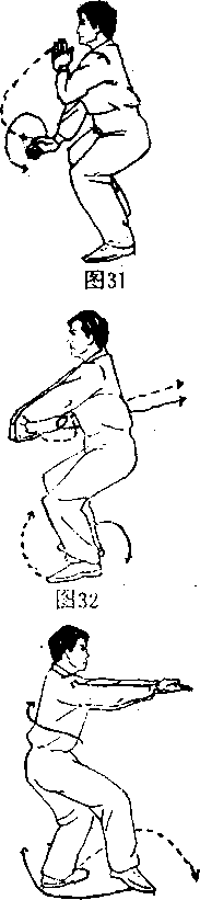 两下肢不动,掌前伸向后抓 起,在腹前成两勾手(如图32)。图33图33左脚向右前方上半步,身体右 转180°,右脚向左后方横移半步, 成右食鸡步,两勾手转身时变仰掌 收抱腹间,再向前托出,掌心朝 本(如图3) 图33图33