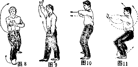 右脚后退半步,停于左脚内侧,左掌下穿,至左腿 外侧成俯掌。右掌上架于头上方,身体右转90 (如图9)。(3)上动不停,两腿屈膝下蹲成马步,同时两手一齐 向前推出(如图11)。(3)上动不停,两腿屈膝下蹲成马步,同时两手一齐 向前推出(如图11)。上动不停,左脚上前一步:身体右转,双膝微 屈,两掌收至胸前,右手变拳,拳心向外,左掌贴于右拳背 上(如图10)。.(3)上动不停,两腿屈膝下蹲成马步,同时两手一齐 向前推出(如图11)。(3)上动不停,两腿屈膝下蹲成马步,同时两手一齐 向前推出(如图11)。