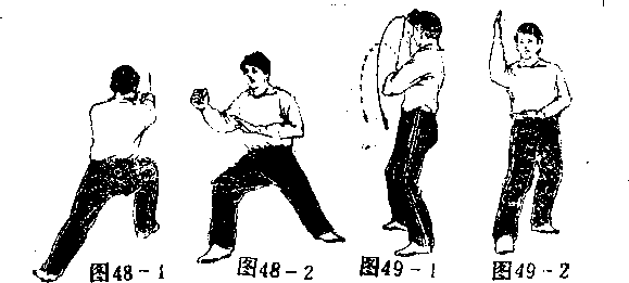 右脚向左脚前上一步,身体左转90°成右虚步,布 拳变立掌收至腹前,上穿高过于头(如图的一1附图49一2“反面图”。左脚向前上半步,右脚随之上半步同时々体向左 向后转体180成左虚步5左掌由轲前向左前下方劈掌,力达掌指,右手经体前下收至右腰间(如图50)。