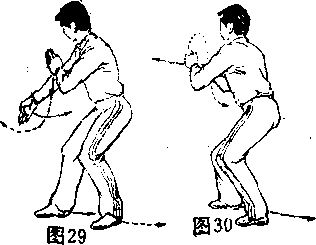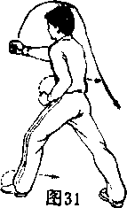 右脚后退半步,成左弓步。同时,左手从右经面前,向 茬.转,抓,变立拳收回右腰间,拳心贴腰,右掌变立拳向前冲 出,目视右拳(如图31)。