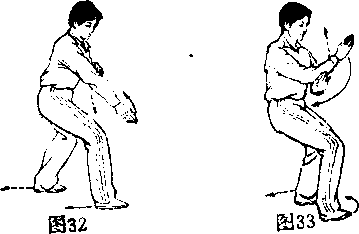 -左脚尖向里扣转,右脚尖外摆,上体右转南), 左拳变掌经胸前,商右抉在右小臂内侧,掌尖斜向前上,右 拳变掌随体右转,从左上向裆前方推击,成斜俯掌,目视右 手(如图32)
