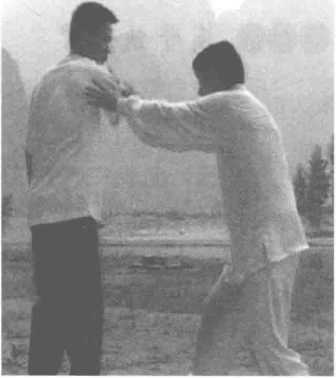 4.向前攻推。双手向前攻推, 推对方大臂外侧和外肩下胸 胁部(图269) o