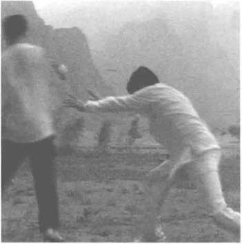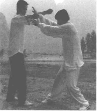 本式为曾庆宗独创。当我完成冲 天炮式时,对方从后面进击,欲用右 手击打我头部,我向右转身,两手绕 圈转环,保护好自己,同时接截对方 手臂,向右继续转环,偏沉得势后, 即向前攻推,两手臂如牛之两角,向 前顶打。如果是左拳打来,我双手即 从左边向左绕圈转环,然后向前攻推 顶打。此式迎敌左右皆可应用。