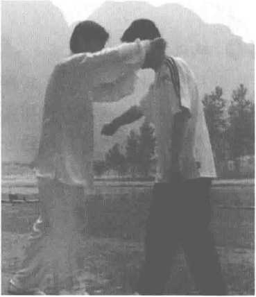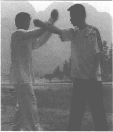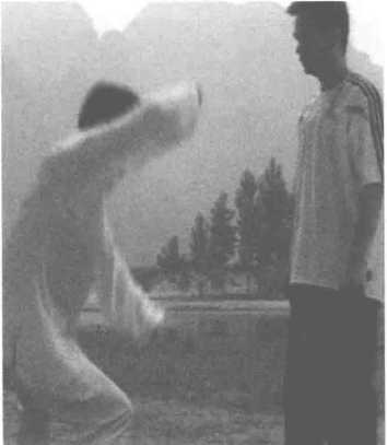 敌方右拳打来,我的双手转环 举上,变成双立桩,从其右臂切入 压下,偏沉挡开其臂。再从两边分 开转环向上,夹击敌之双耳,此招 称为双风贯耳。