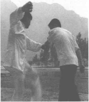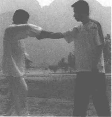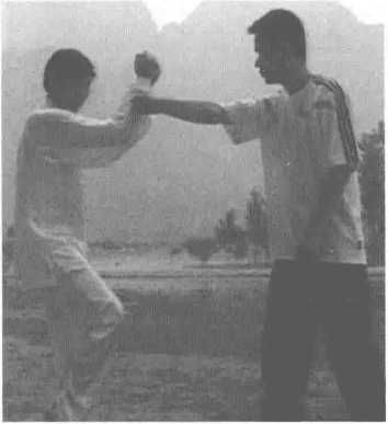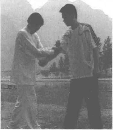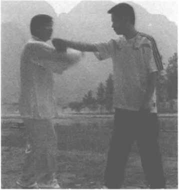 1.右手打来。敌方右手打来时,我 向左后稍移,双手转环到对方右 拳的右边(图285) o