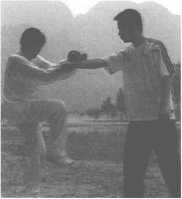 2.压臂出脚。双拳迅速砸 下,偏沉敌臂。
