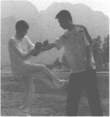 3.压臂踹脚。起右脚踹击敌人 膝部或裆部。