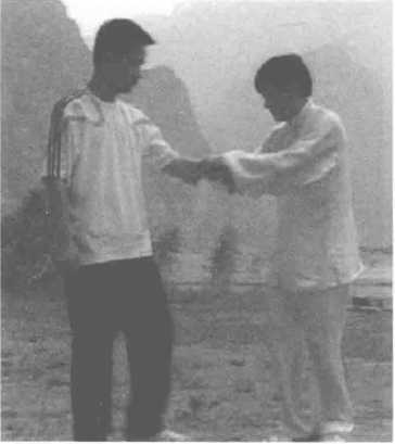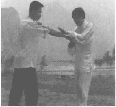 2. 上步搭腕。左手转环搭于 对方右臂腕部,同时左脚 向前进步,粘黏控制对方 手腕(图299) o
