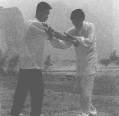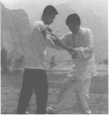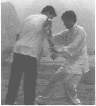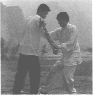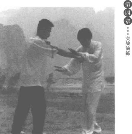 对方右拳打来,我用左手从内侧穿捋偏沉其手腕,并顺势抓住向 后捋带。我上左脚,右手从敌之上臂穿进,抱住敌人,左手外撑,右 手回拉,向右后提拉,将敌摔到后面。等到敌方失势时,我还可变招 打击之,如提起右脚,踹其小腿,或将右手穿进抱其肘关节,向后提 摔,此招会对敌方形成更严厉的打击。