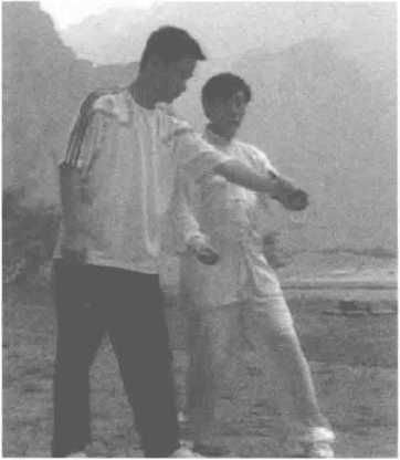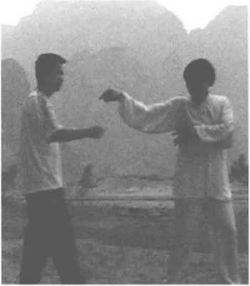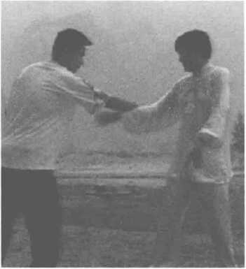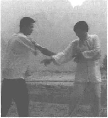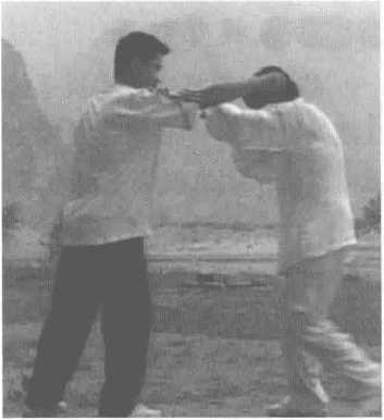 敌人从后方打来,我向右转 走,同时右臂从对方右腋下的空 隙处穿上,向左绕环,偏沉提起他 的右臂。然后转身,我的左手从自 己的右臂下穿出,托梁换柱代替右 手,趁势左脚踏进敌右脚旁,用右 手掌击敌人胸部,此招即为玉女穿 梭,又称为是穿手打掌。