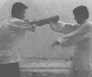6. 托梁换柱。左臂继续偏沉相随对方右臂,使对方不得机势,让我的右手 获得自由(图313) o