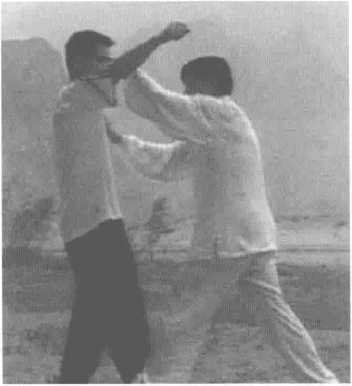 当敌方左手来击时,我右脚即 向敌左后方摆步,同时右手捋带敌之 左腕,将其手臂拉直。左手从敌左腋 下穿上,用掌心扇打其嘴。使用这招 时的变招很多,可以右脚向前一踩, 置于他的身前,右肩靠击对方左大 臂,左手向后继续捋带。也可以脚变 成拗弓步形,左脚在前,右脚在后, 形成左脚为弓,右脚为绷之式,将对 方摔在地上面部朝地。