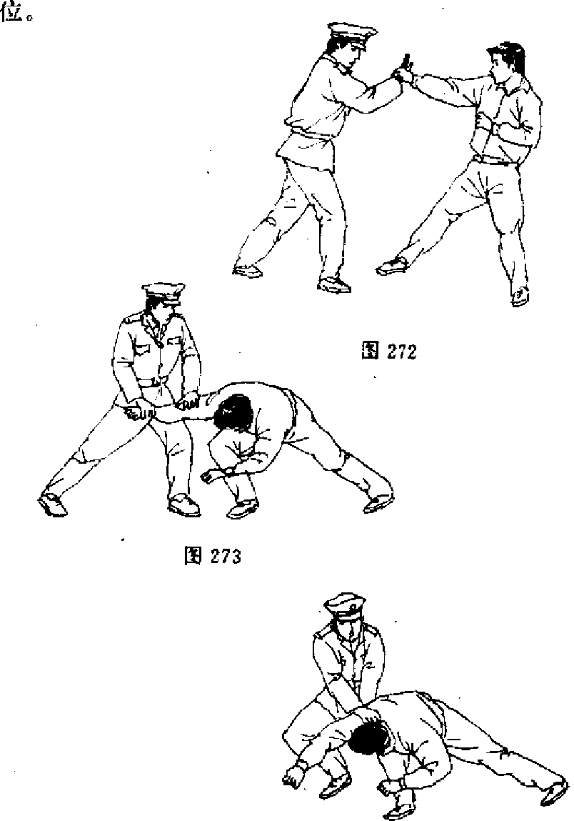 【动作说明】当故人用右拳向我面部击来时,我速上左 步,同时用右手挡抓敌右腕(图272),然后右手向右下方牵 带,左掌同时贴按敌右肘关节处,配合牵带(图273),运内劲 于右掌,向下猛拍敌脑后风池穴(图274).