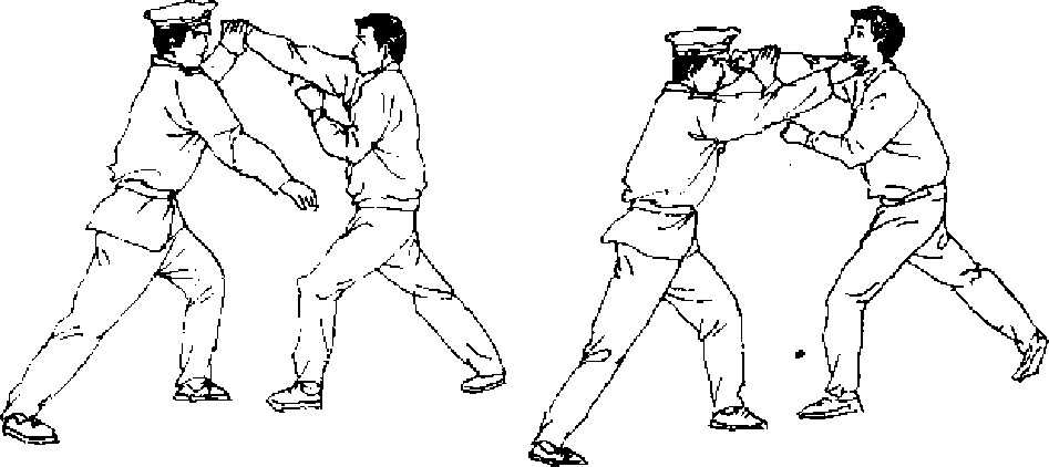 【动作说明】当敌左拳虚晃,突然用右拳向我面部击来 时,我速用左手挡抓敌右腕(图275),接着用右掌插击敌咽喉 穴(图276),