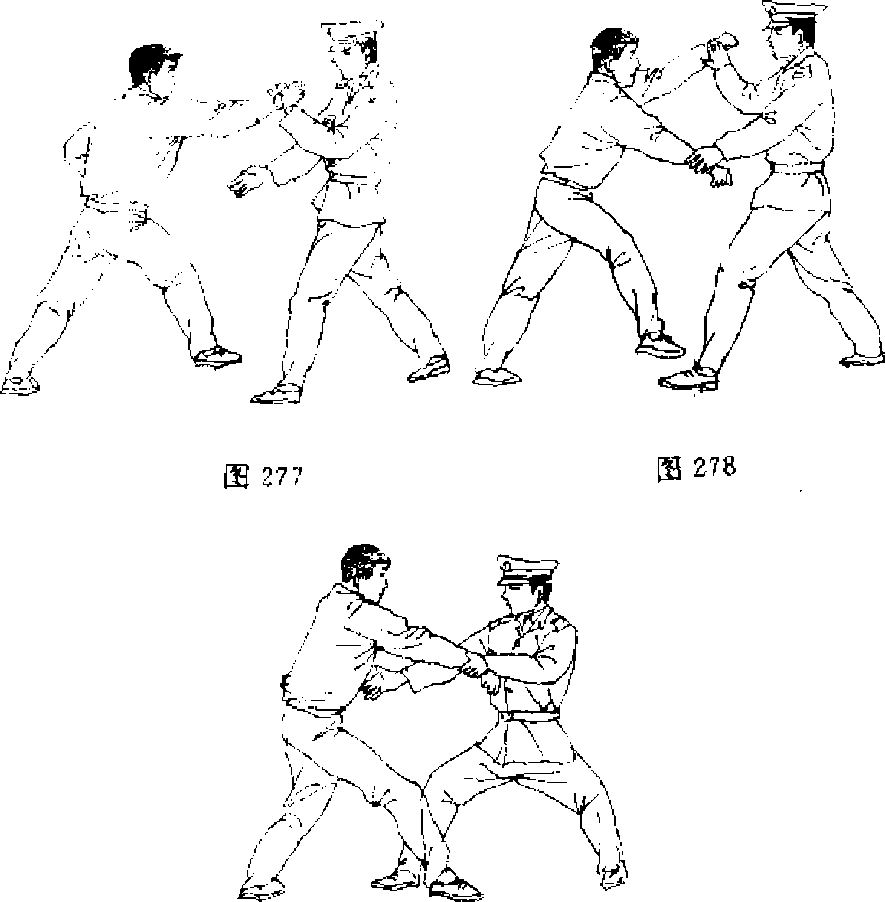 【动作说明】当敌突用右拳向我击来时,我速用左手向 外格挡敌右拳腕(图277),敌继而用左拳向我击来,我再用右 拳向下格压敌左腕(图278),接着速用右掌插击敌腹部丹田 穴(图279)。