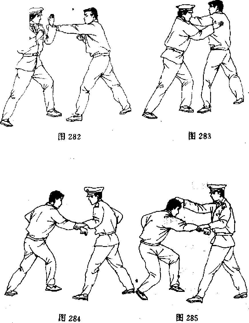 【动作说明】当敌左拳虚晃,突然用右拳向我胸部击来 时,我速用左手挡抓敌右腕并下拉(图284),接着速运气于右 掌,拍击敌头顶百会穴(图285)。