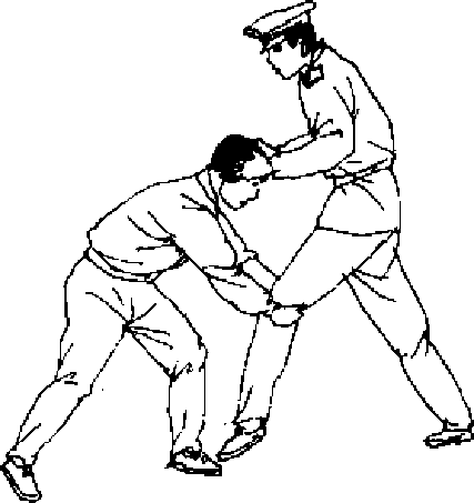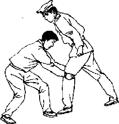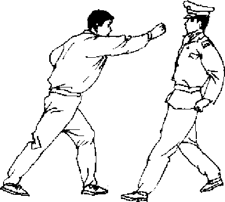 【动作说明】敌在我正前方,突然用右拳向我面部击来 时,我速向后吞身闪避(图288),敌迅速上步弯腰,抱我左腿, 欲将我摔倒(图289),我迅速用双掌拍击敌左右耳窍穴(图 290).