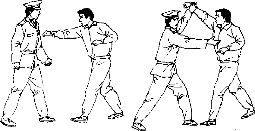 【动作说明】敌站立我面前,突然用右拳向我胸部击来 (图291),我速用左手挡抓敌右腕,并同时用右掌击打敌玄机 穴(图292)。