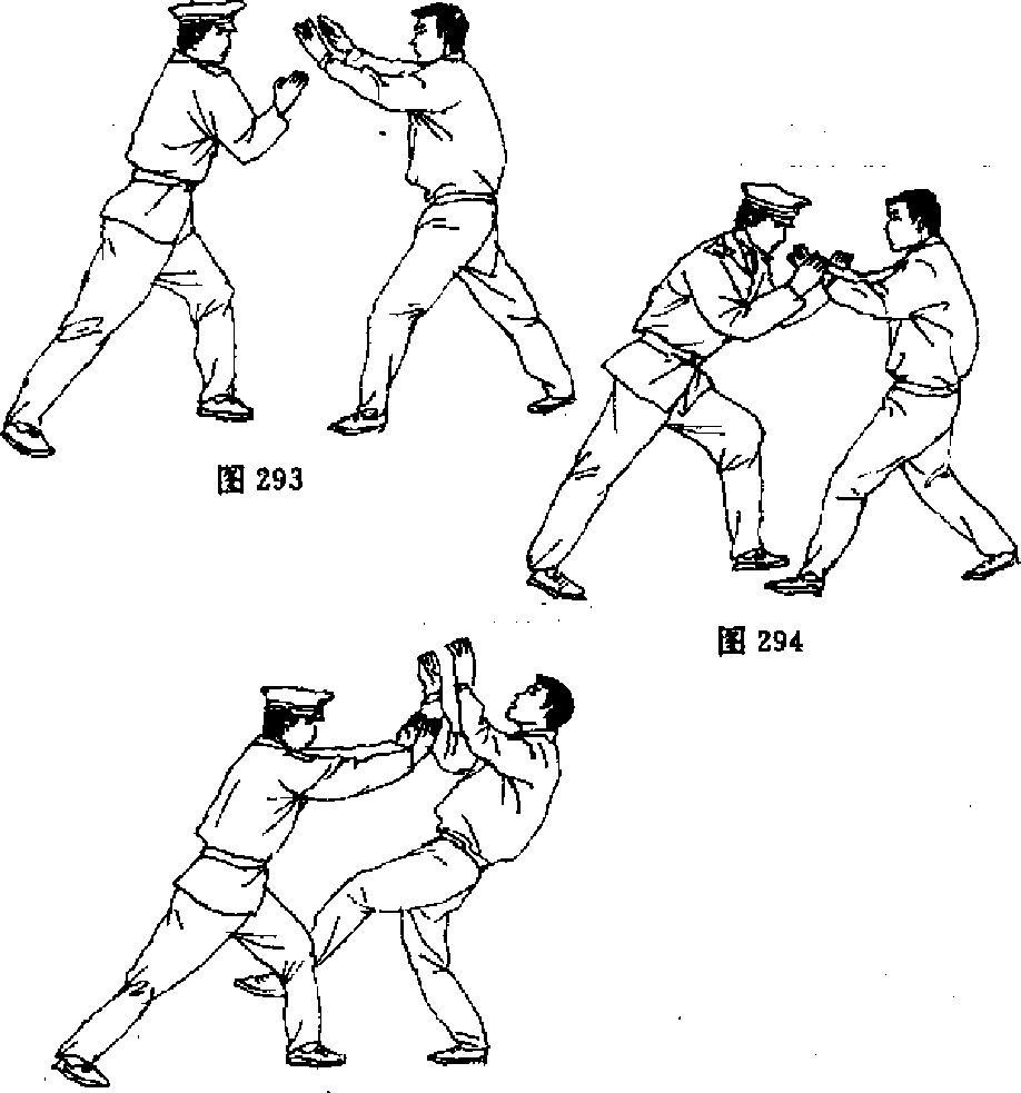 【动作说明】 当敌双掌向我面部击来时(图293),我速 用双手向回向下搂带(图294),接着速运气于双掌抖击敌心 坎穴(图295).