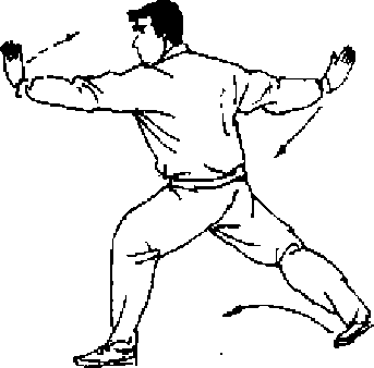 【动作说明】身体从左向后转体i8(r,左腿前弓成左弓 步,同时左掌随转体屈肘收至胸前,再向前直臂立掌推出,掌 高不过眉,小指一侧朝前。右掌前臂内旋变勾手,直臂平举于 体后,勾尖朝上孑目视前方(图41DO