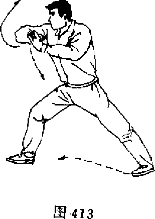 1. 左脚抬起原地震脚,左腿略蹲支撑身体重心,右脚抬 起跟进&同时左掌以拇指一侧为力点屈肘挑掌,掌高不过头, 掌心朝右,掌指朝上,右手前臂外旋变仰掌屈肘收于腰间,掌 指朝前:目视左掌(图412).