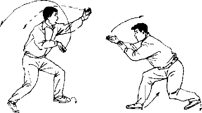【攻防含义】若对方由身后击来,我当突旋身使右掌拍 击对方面部.如对方出手来迎,随即右掌下捋对方胳膊上侧, 向内撤回,左掌同时拍击其面部。若对方仍使手迎截,我左掌 顺势向F捋其手臂,急变右掌为迅雷掌猛击其鼻、喉或胸部“
