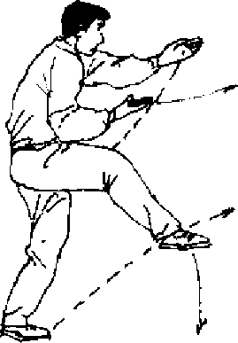 上体以左脚为轴,随右腿向右转约180、右掌由额上 方向右下绕屈至腹前,掌心向上,掌指朝前,左掌向前拍击,右 脚同时向前踢出,目视前方(图441) o