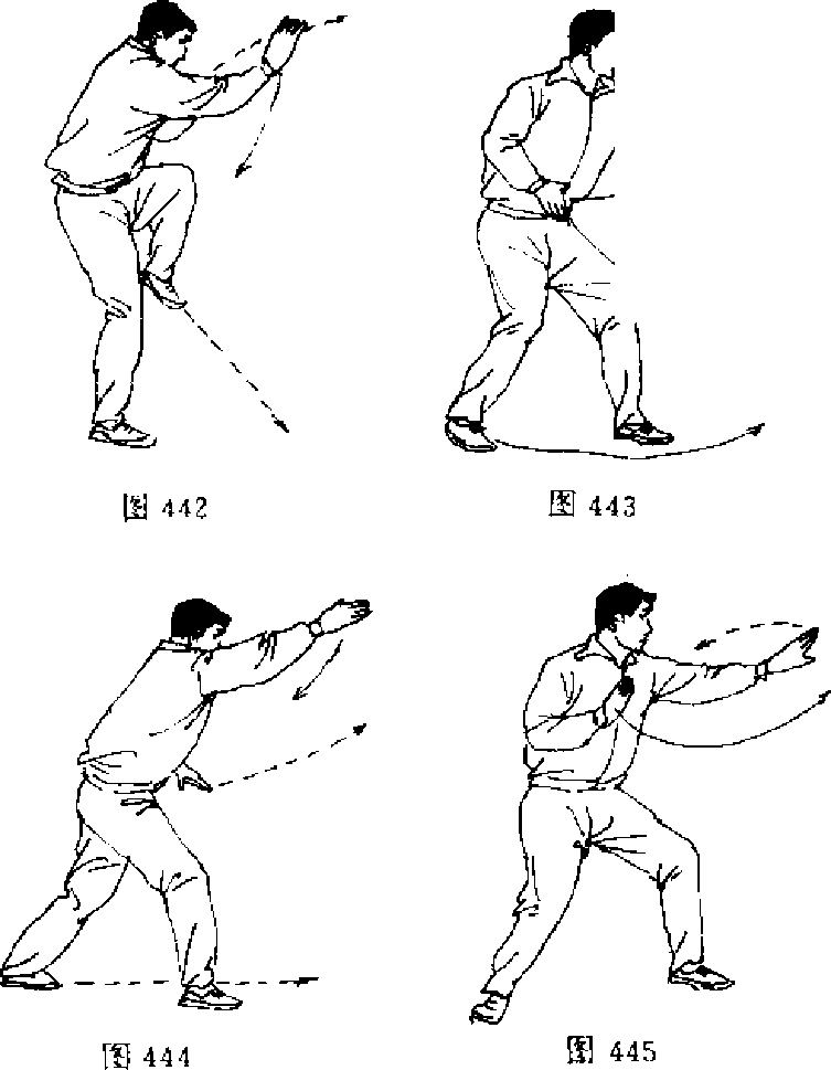 1.左脚向前上一步「双膝微屈,左迅雷掌同时变穿梭掌 前直穿出,掌心向右,掌指朝前'目视左掌,右迅雷掌由前变掌 屈肘向内收至腹前(图443)O