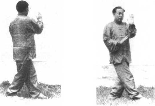 身体右转,左脚向后退一步;左手随转体经面前像猫洗脸 一样向右摆掌至右耳前方,掌心向右,左手摆掌时要屈肘立前 臂向右掩,肘尖至心窝前;同时右手向下、向右摆至右胸前;掌 指斜向左,掌心斜向下;目视左掌。(图2-99)