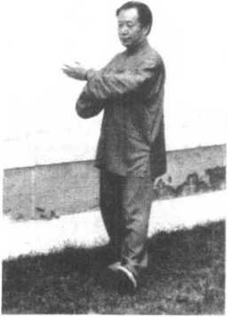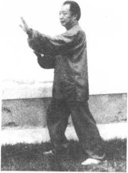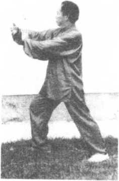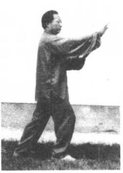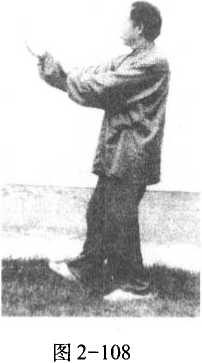 左脚向左后方撤一 步;右手向右前方伸出, 掌心斜向外,高与眉齐; 左手外旋,掌心转斜向 上,置于右肘内侧,两掌 斜相对;目视右掌。(图 2-104)