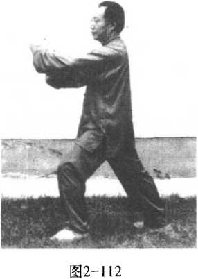 左脚向左前方迈出 一步,右腿蹬伸,自然伸 直,左腿屈弓成左弓步; 两手臂向左前方挤出, 两臂撑圆,左掌心向内, 掌指向右,右掌附于左 腕内侧,掌心向外,指尖 斜向上;目视左腕。(图 2-111、图 2-112)