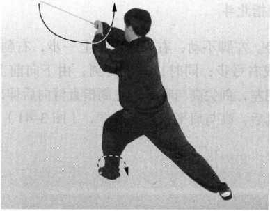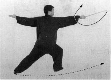 动作一:接上势。重心左移,左脚尖外撇,右脚尖内扣, 剑 身体左转,左腿屈膝半蹲,右腿伸直成左弓步;同时,右手持