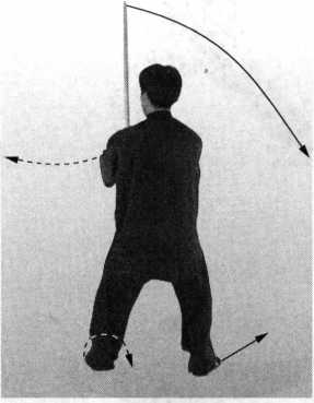 动作二:上动不停。左脚尖内扣,身体右转,两腿屈膝半 蹲成马步;同时,右手持剑外旋,屈肘由左经后向右划一平 圆,再向左斩出,手心朝后,剑尖朝上;左剑指变掌,附于右 手上,手心朝内,虎口朝上;目视前方。(图3-43)