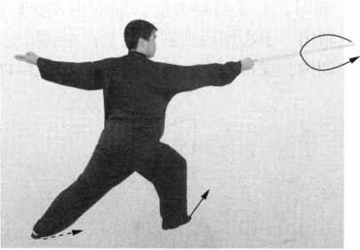 剑内旋,由右向左划弧直臂刺出,手心朝下,剑尖朝左,高与 头平;左剑指屈肘附于右手腕处,手心朝下,剑指朝上;目视 剑尖。(图3-42)