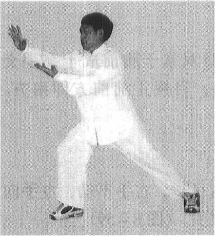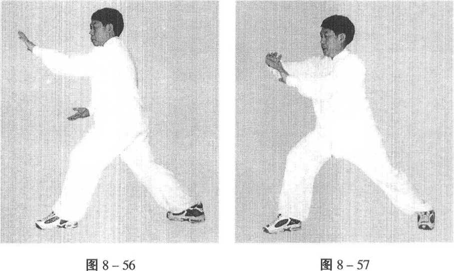 (2)右脚上前一大步,右掌同时向前方挤出,左手 按在右腕上,目视右腕。.(图8 -57)