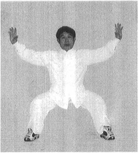 重心左移,成马步,同时双掌于胸前成十字手交 叉,向左右分开,掌心向外,目视正前前方即南方。 (图 8-58)