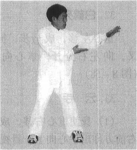 (1)身使重心右移,成右弓步,右手不动,左手向 右前方伸出手心向上,目视双手。(图8-59)