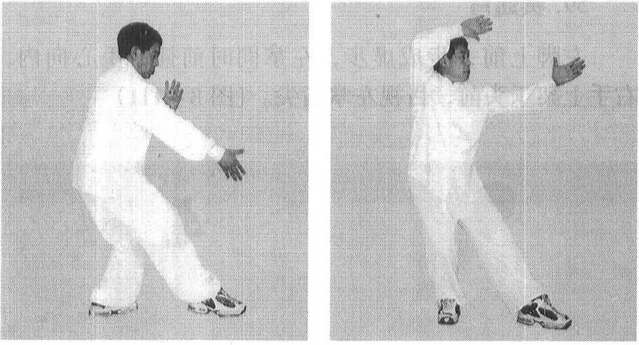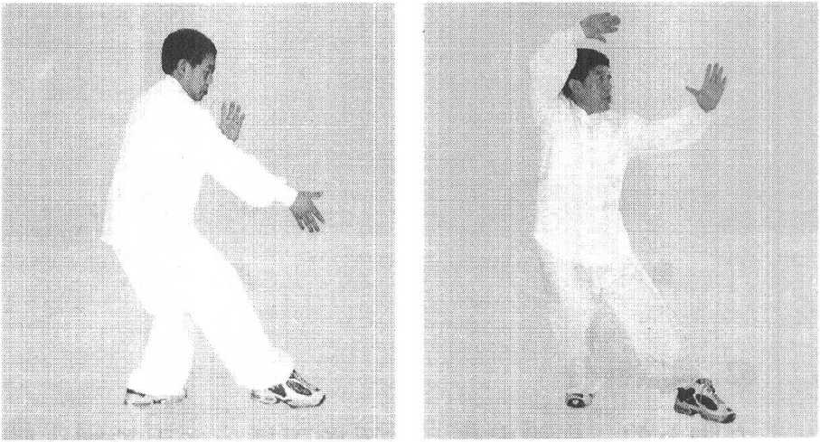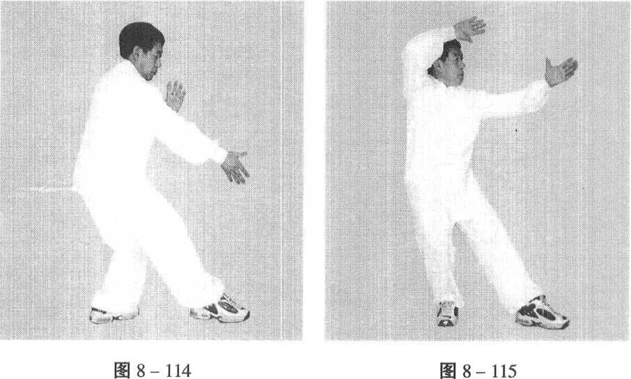 右脚上前一大步,右掌同时由后向前挤出,手心向 下,成横掌式。目视右掌,左手按在右腕上。(图8 - 117)