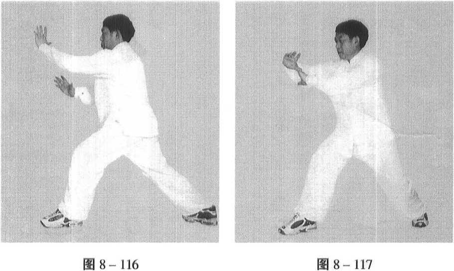 身体右转同时右脚退后一步,右手带回,收于右胯 前,掌心向上,左掌向前擘出,与头同高,目视左掌。 (图 8-116)