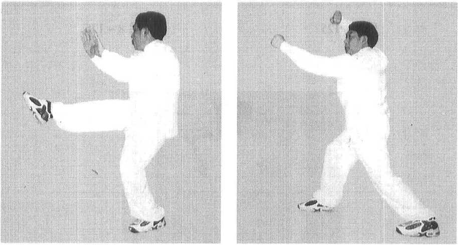 莲、双拿由后至前摆动击响,停止左方。目视双掌。