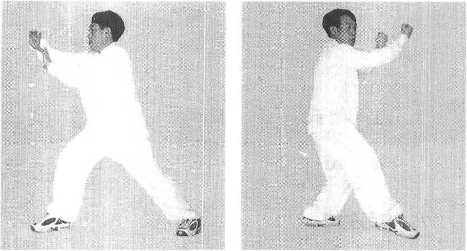 左脚上前一步,右脚接上一大步,同时右掌向右前 方挤出,手心向下,左手按在右腕上,成右弓步横撞掌