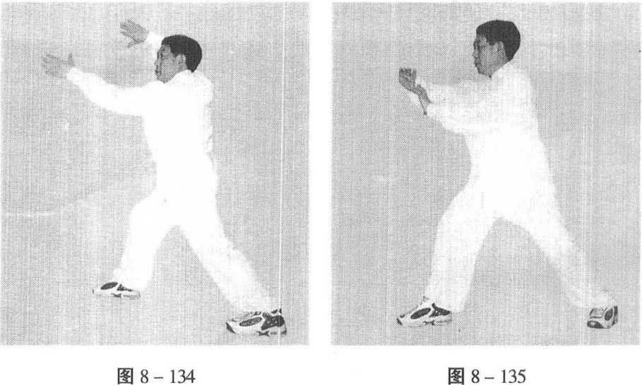 右脚落于右后方,成弓步,双掌由下向右向左前方 打出,右掌上架头前方,左掌打出,双掌心向外,目视 左掌。(图8-134)