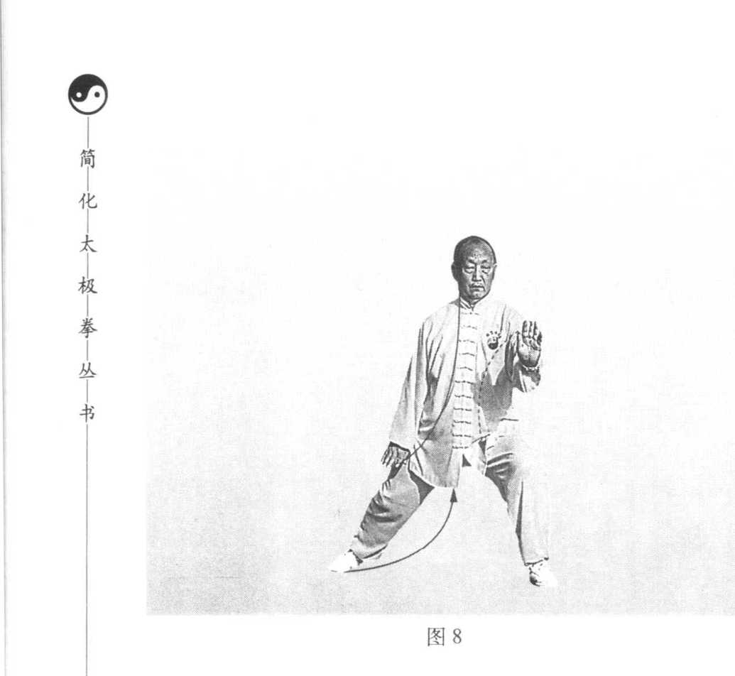 两脚以脚跟为轴,脚尖向左转动,左脚尖转 向前(南),右脚尖转向南偏西,成左弓蹬步。 同时,左手内旋,手心朝前向右弧形上提,高与 肩平;右手弧形下按至右胯根前,手心向下。身 体转向正南。眼顾及左手(图8)。