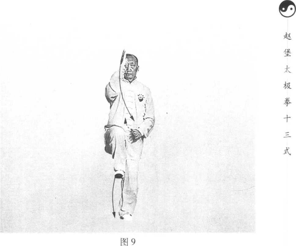 右脚蹬地,提膝向上,高与胯平,脚尖向 前,脚心正对地面,成左独立势;左脚趾抓地, 脚尖向南不变。同时,右手外旋,手心向左弧形 上提,高与头平,右肘与右膝相对;左手向里经 胸前下落至左胯根前,手心斜向右下。眼向南平 视(图9)。
