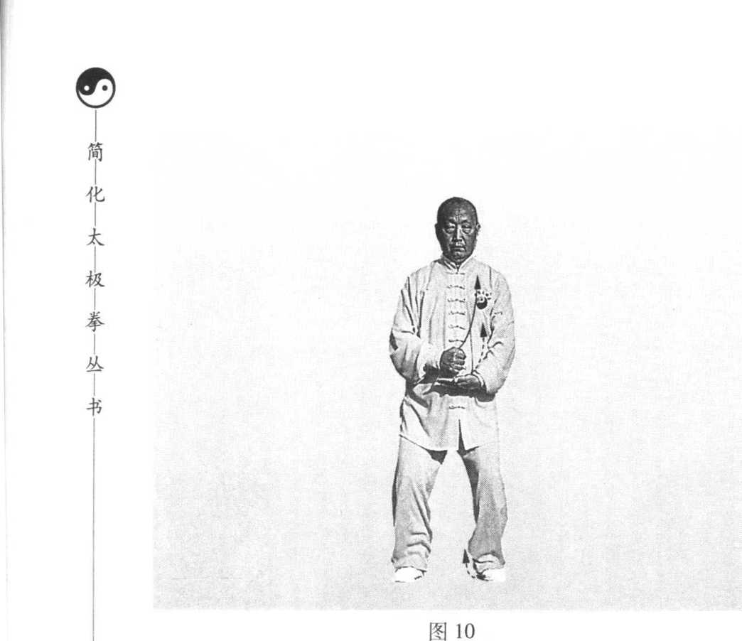 右脚落下踏实,与肩同宽;左脚虚,脚尖点 地。同时,左手外旋,手心向上,平置于胳下, 与腹部距离约一寸;右掌逐渐变拳,弧形下落置 于左手上方,与左掌心和腹部相距均约一寸,略 高于肚脐,拳眼向上,拳心向里。眼向南平视 (图 10)。