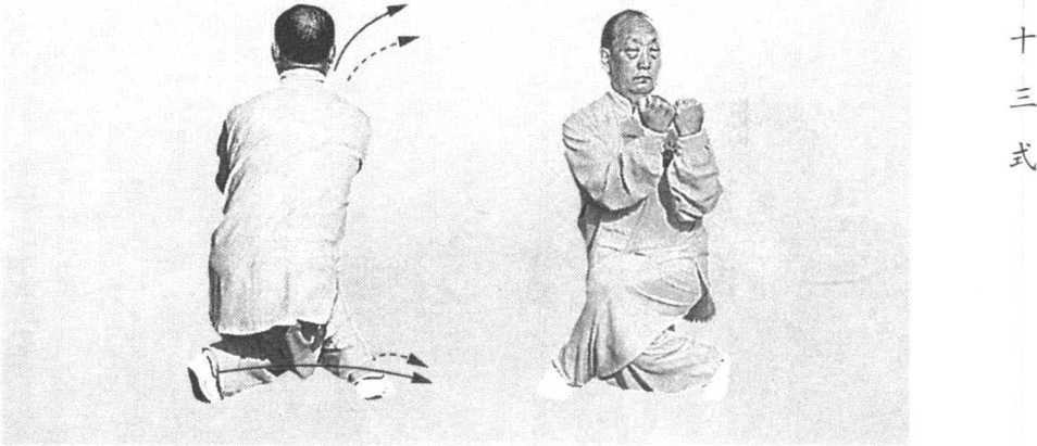 身体转向北,两腿成交叉步。同时,双拳随 转体,向左下方划弧至左大腿上方,拳心向里, 拳面向上,提至胸前。眼顾及双拳移动(图25、 附图25 )〇